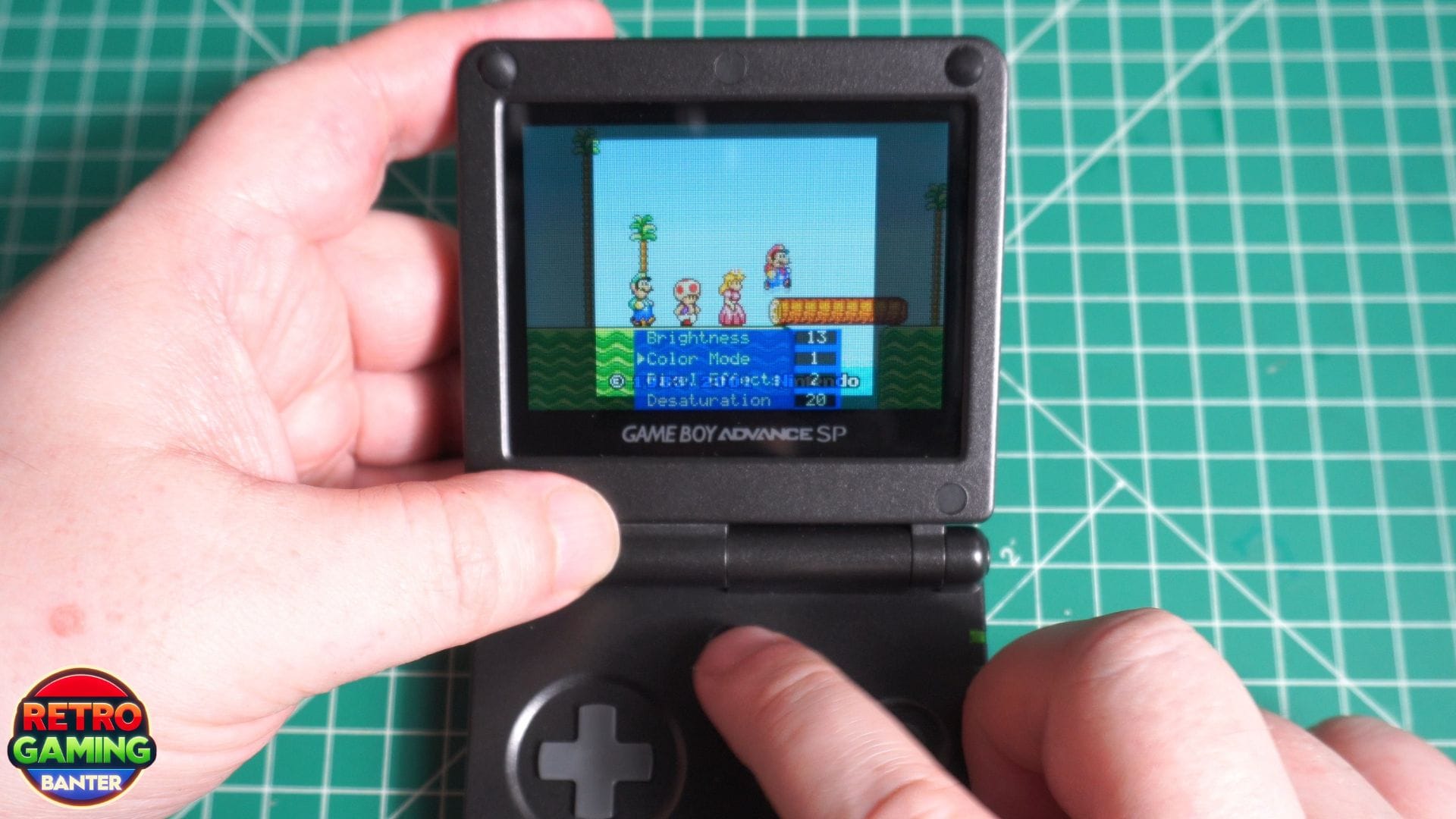 When the brightness button is soldered you can tap it to cycle through the brightness levels. You can also hold it down for a few seconds to bring up the menu. Here you can change the brightness, colour mode, pixel effects, desaturation, FRM enable or disable which a couple of games may require enabled, and to enable or disable the touchpads.